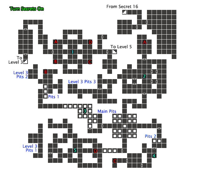 The puzzle is simple but it can be difficult. When you first step on the floor switch, the pits will close one at a time, but only for a few seconds. There are also 2 paths, the normal path that goes straight east then south, and the secret. The secret is activated by a button on south wall above the 2nd pit, which opens a passage south just a few more squares to the east. I would recommend strafing to left across the pits to safely press the button and enter the secret area.